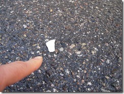 アスファルトの表面にある白いものが民宿ことぶきの塗装片。